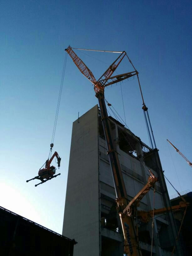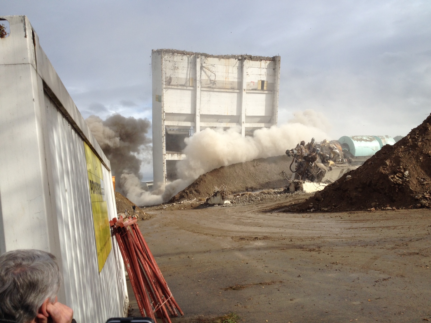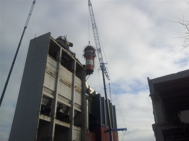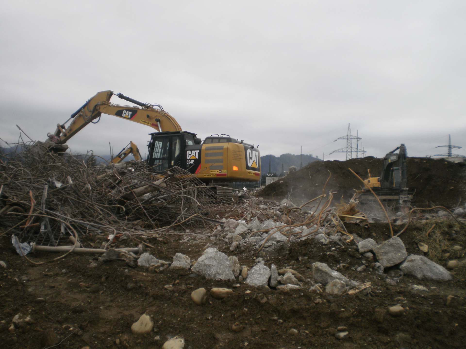 Durch eine missglückte Fehlesprenger der Vorgängerfirma fiel ein Gebäude auf das Maschinenhaus  und die Firma Pongratz Spezialabbruch wurde damit beauftragt die Abbruch- und Sprengarbeiten fachmännisch zu beenden. Schon im November 2013 wurde mit den Aufräumarbeiten nach der Sprengung begonnen, dadurch kam es zu geringfügigen Verzögerungen. Ein Spezialbagger wurde von einem 500 Tonnen schweren Kran auf den Kohlebunker gehoben um sich nach unten zu graben und das Gebäude Schritt für Schritt abzutragen. Die meisten Abbrucharbeiten mussten von Hand ausgeführt werden. In schwindelnder Höhe wurde auch die Filteranlage entfernt.
