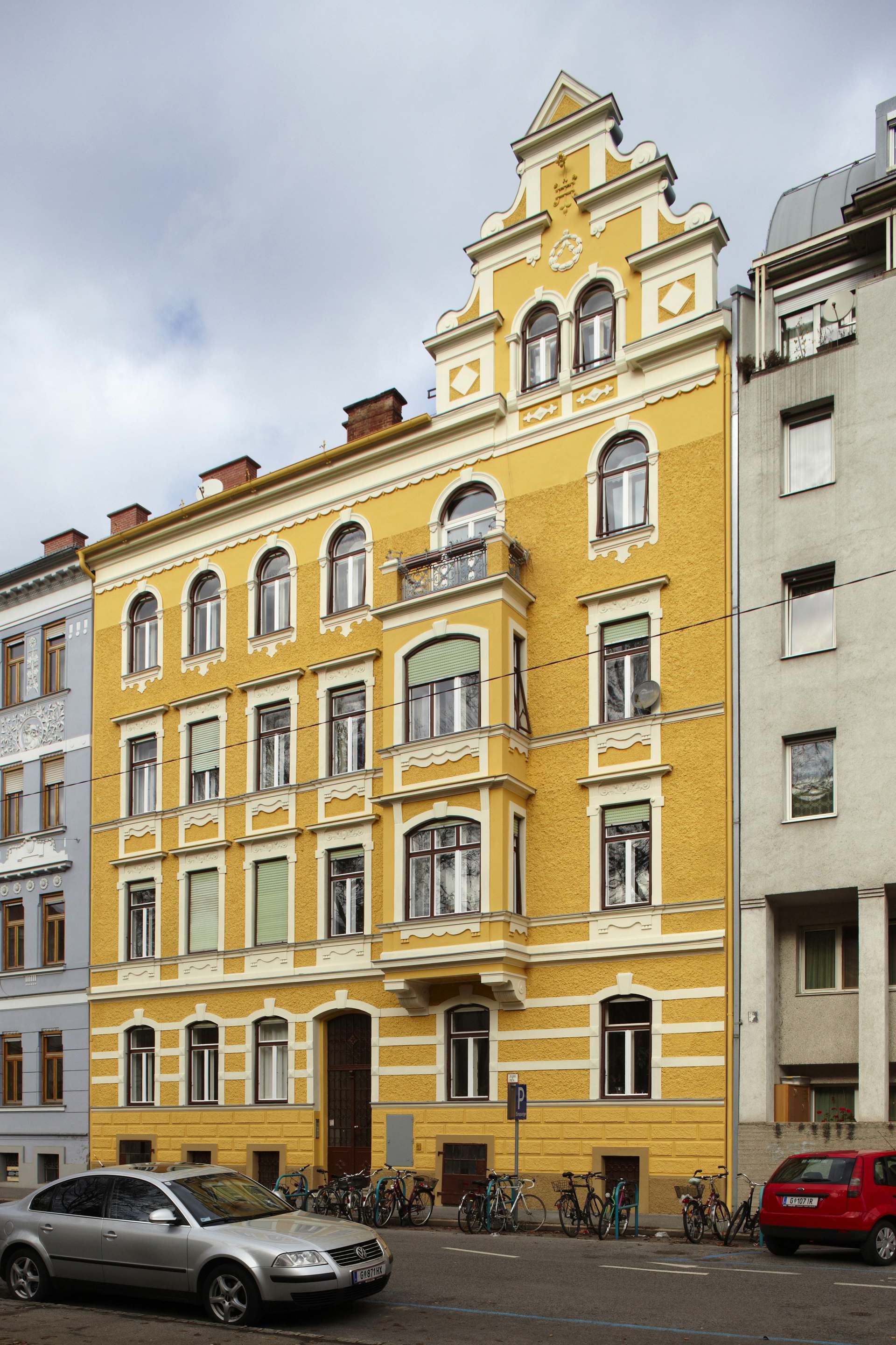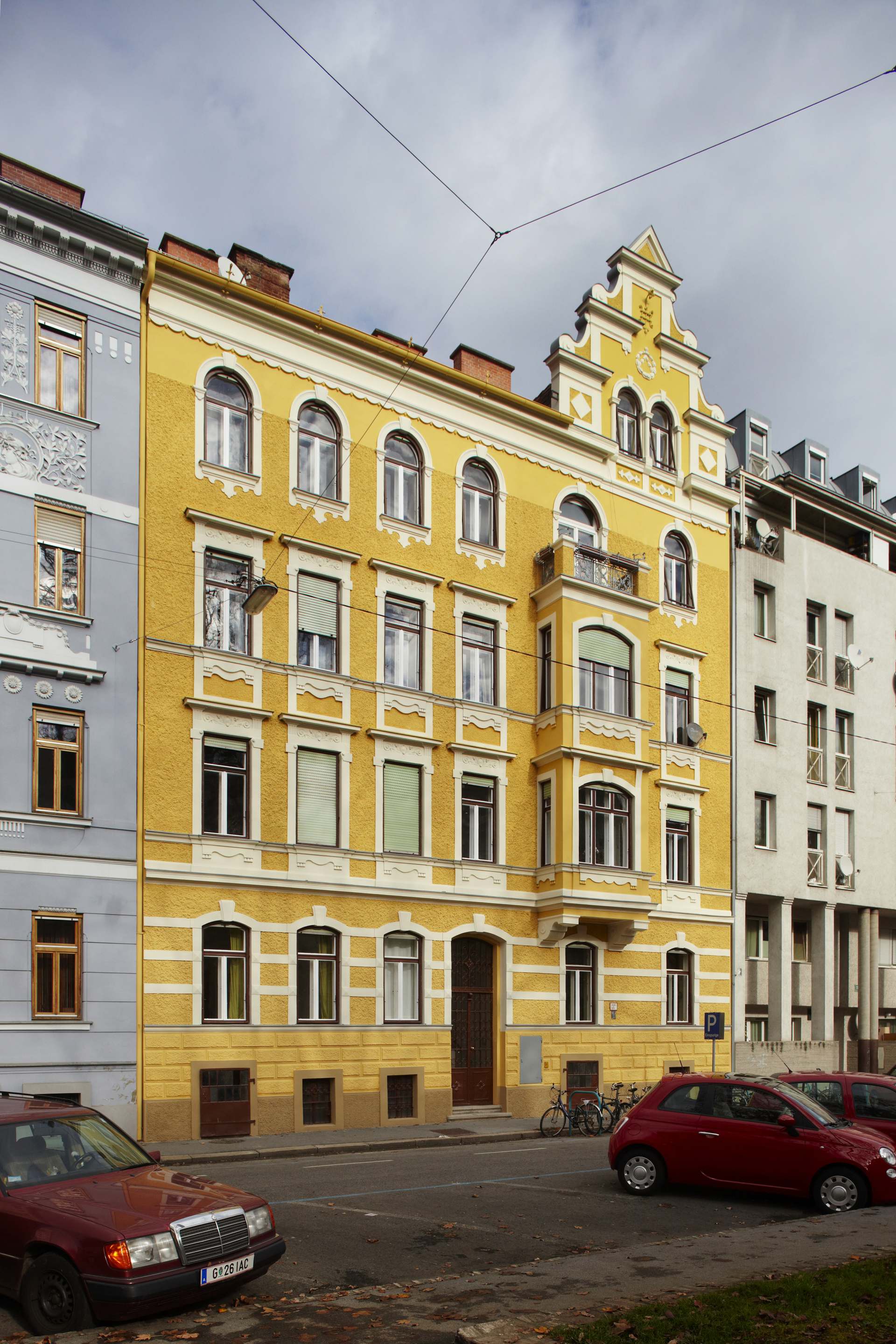 Das viergeschossige Haus, das rein zu Wohnzwecken genutzt wird, wies eine durch Wetterbedingungen, Temperaturunterschiede und nicht zuletzt Verkehrsabgase beeinträchtigte Fassade auf, die eine Sanierung bzw. Wiederinstandsetzung erforderte. Es galt, die besonders schöne Fassade mit ihren Fensterumrandungen und Zierleisten bis ins kleinste Detail in der ursprünglichen Form wiederherzustellen. Pongratz Bau wurde als Spezialist für Fassadensanierungen mit der sensiblen Sanierung der Straßen- und Hoffassade dieses Projektes inklusive der Hofbalkon-Neuherstellung mit Betonfertigteilplatten beauftragt. Die Fassadensanierung erfolgte in Absprache und nach den genauen Richtlinien des Denkmalamtes, wobei besonderes Augenmerk auf die originale Farbgestaltung der Straßenfassade gelegt wurde.