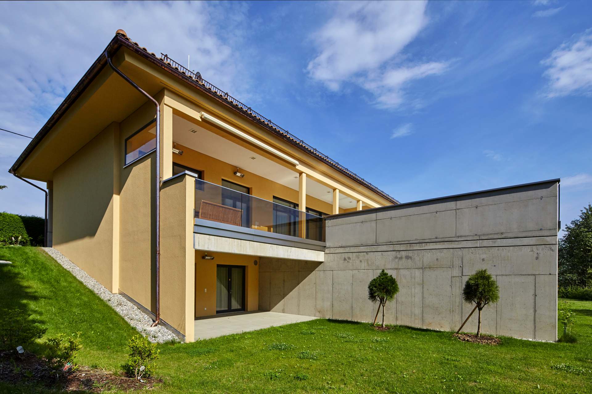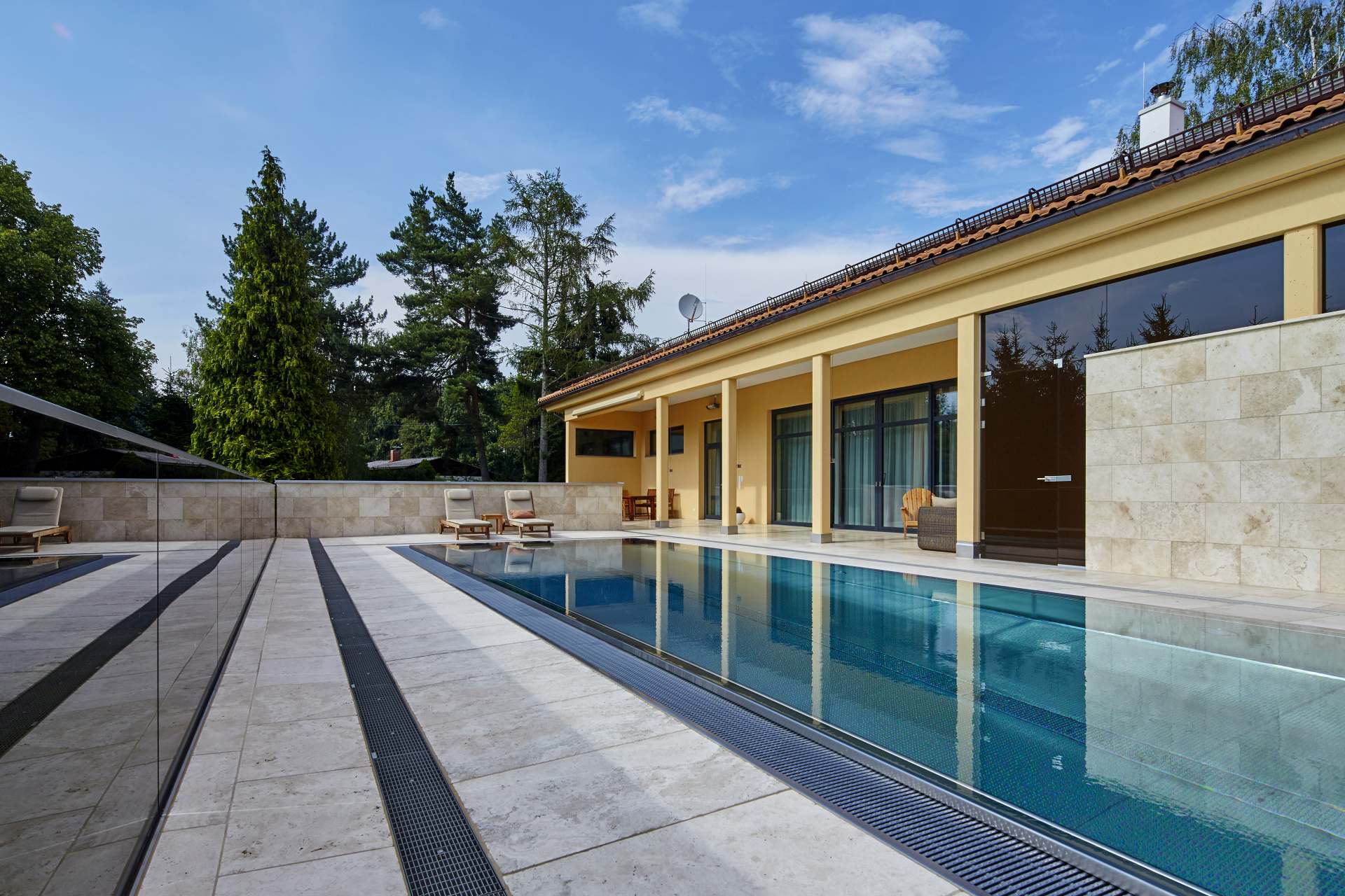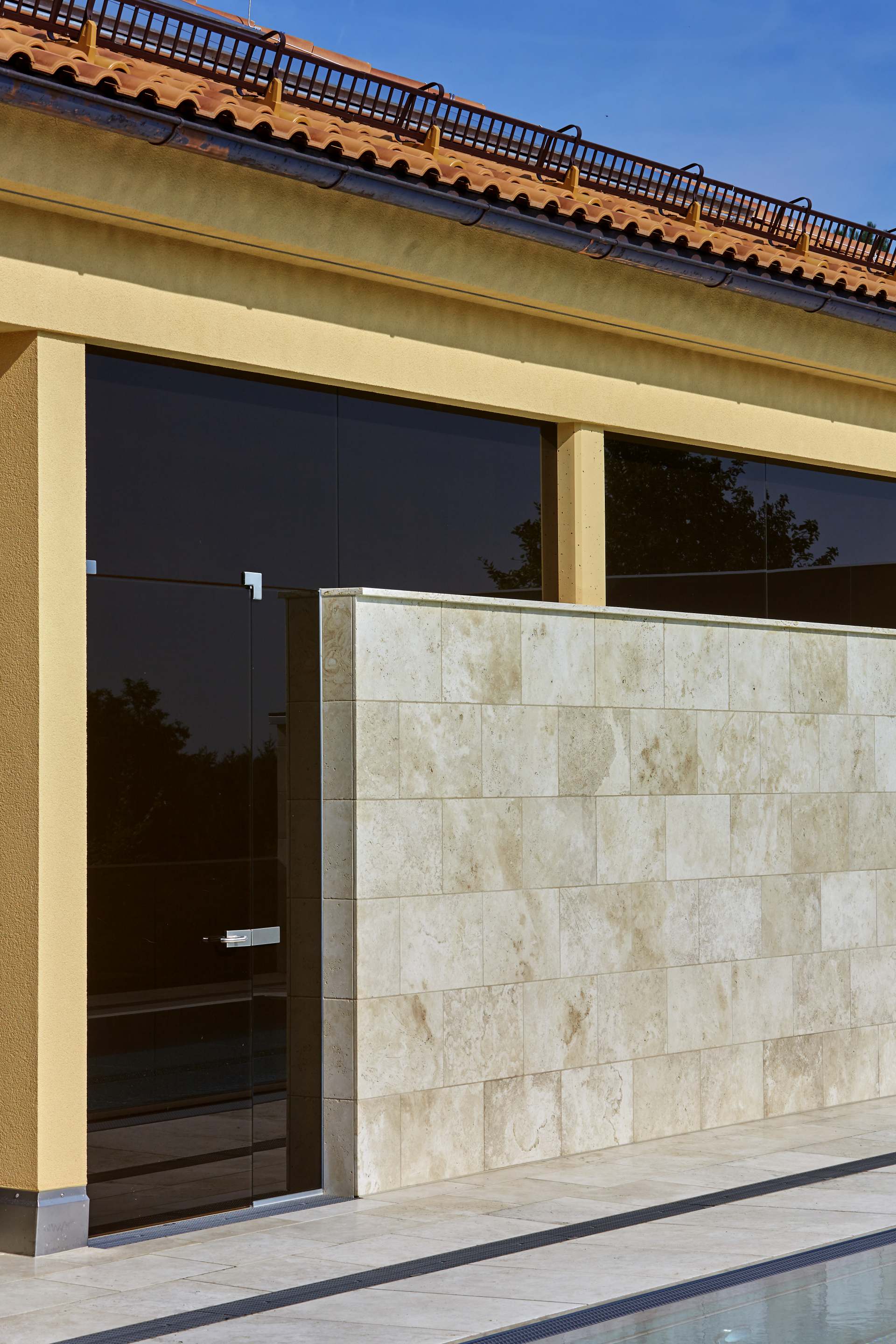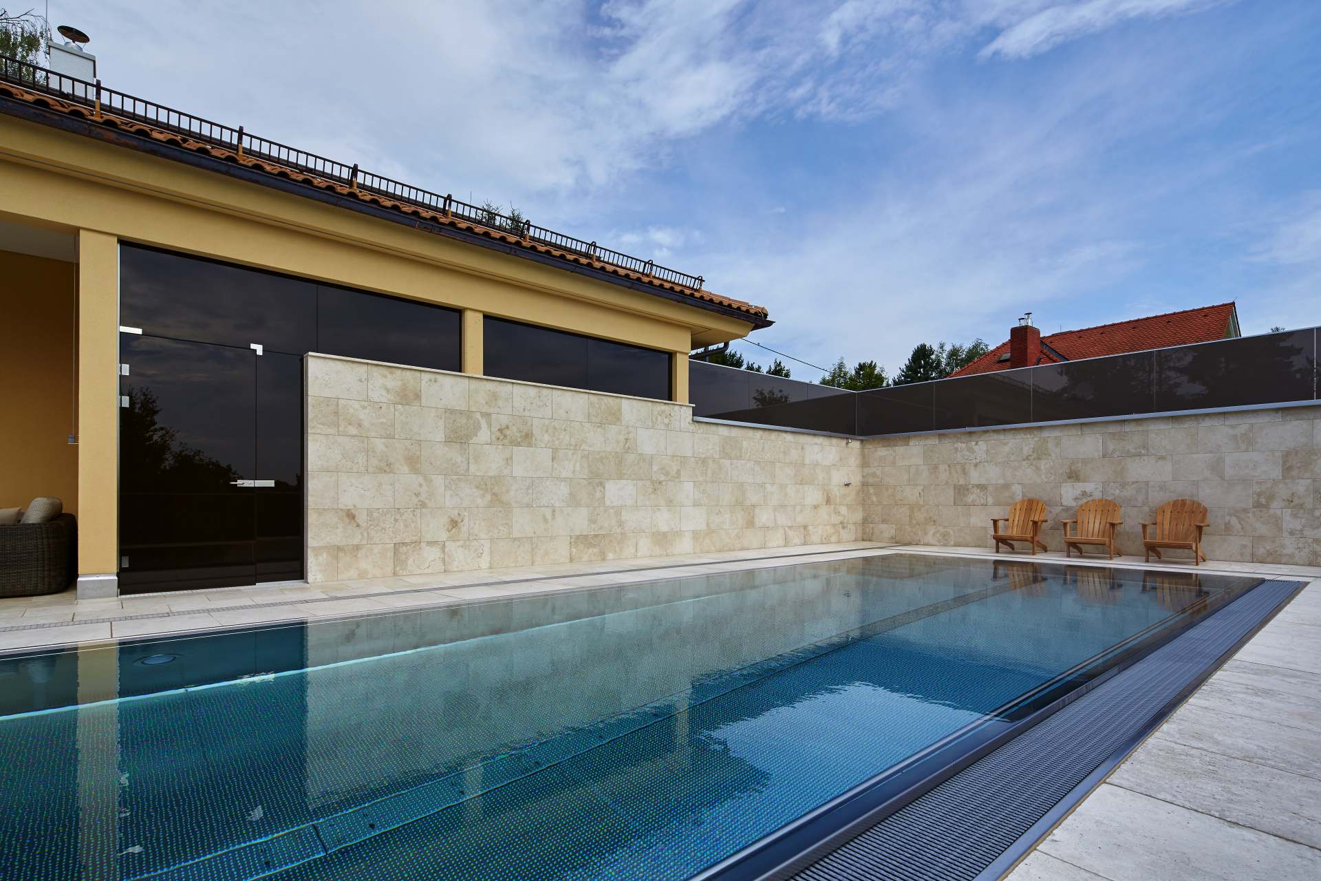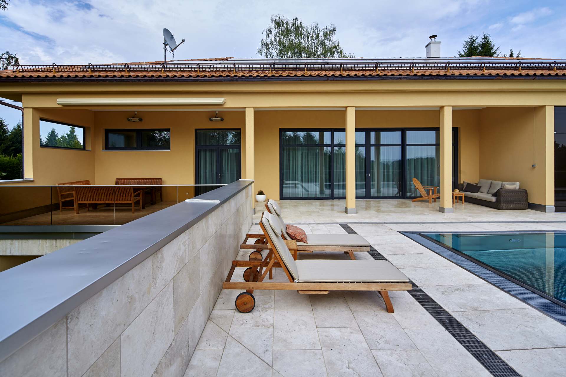 Aufgrund der Lage in einem Hang, musste für den Pool eine aus Stahlbeton ausgeführte Konstruktion getrennt vom Hauptgebäude ausgeführt werden. Diese Konstruktion ermöglicht es vom Erdgeschoß eben auf die Terrasse mit dem Schwimmbad zu gelangen und trotz der Hanglage keinerlei Stufen zu benötigen und somit Barrierefreiheit zu gewährleisten.