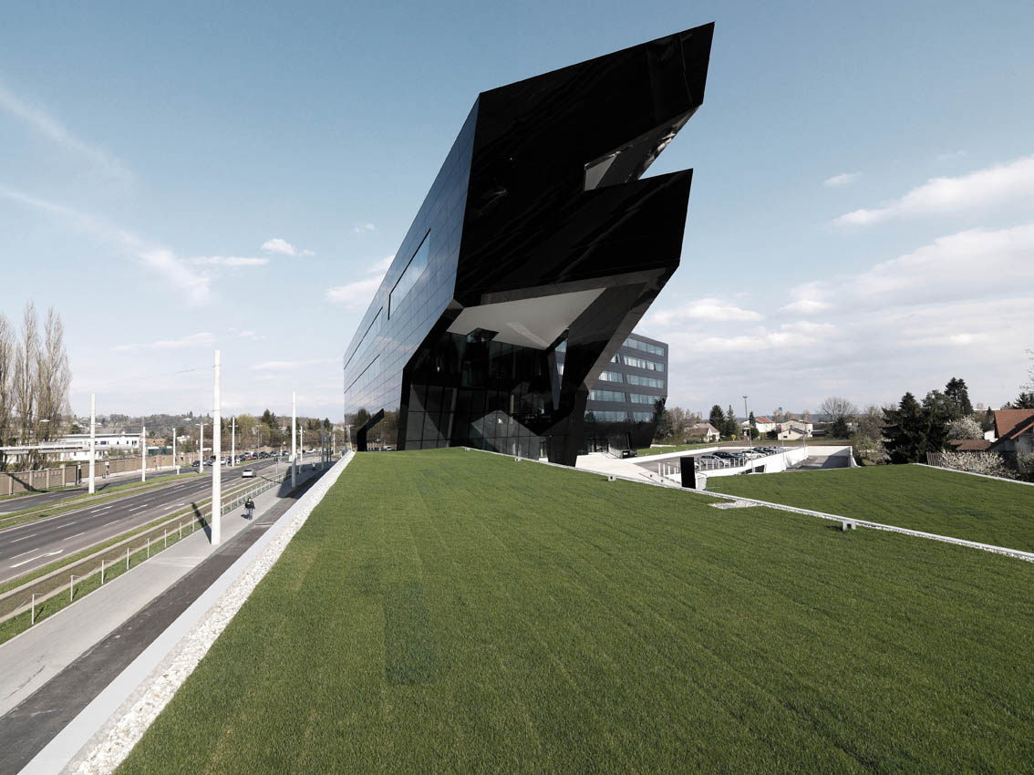 Dynamisch in seiner Form, ein Blickfang vor den Toren der Stadt, als „neues architektonisches Grazer Wahrzeichen“ gefeiert. So präsentiert sich auf 14.438 m² Nettonutzfläche das Headquarter der Michael Pachleitner Group an der Schnellstraße/dem Autobahnzubringer in Graz Liebenau. Der erste Blick wird von der Fassade gefesselt. Umhüllt von einer schwarzen, gläsernen Außenhaut scheint sich das fünfgeschossige Gebäude in seiner Form in Richtung Stadt zu bewegen.