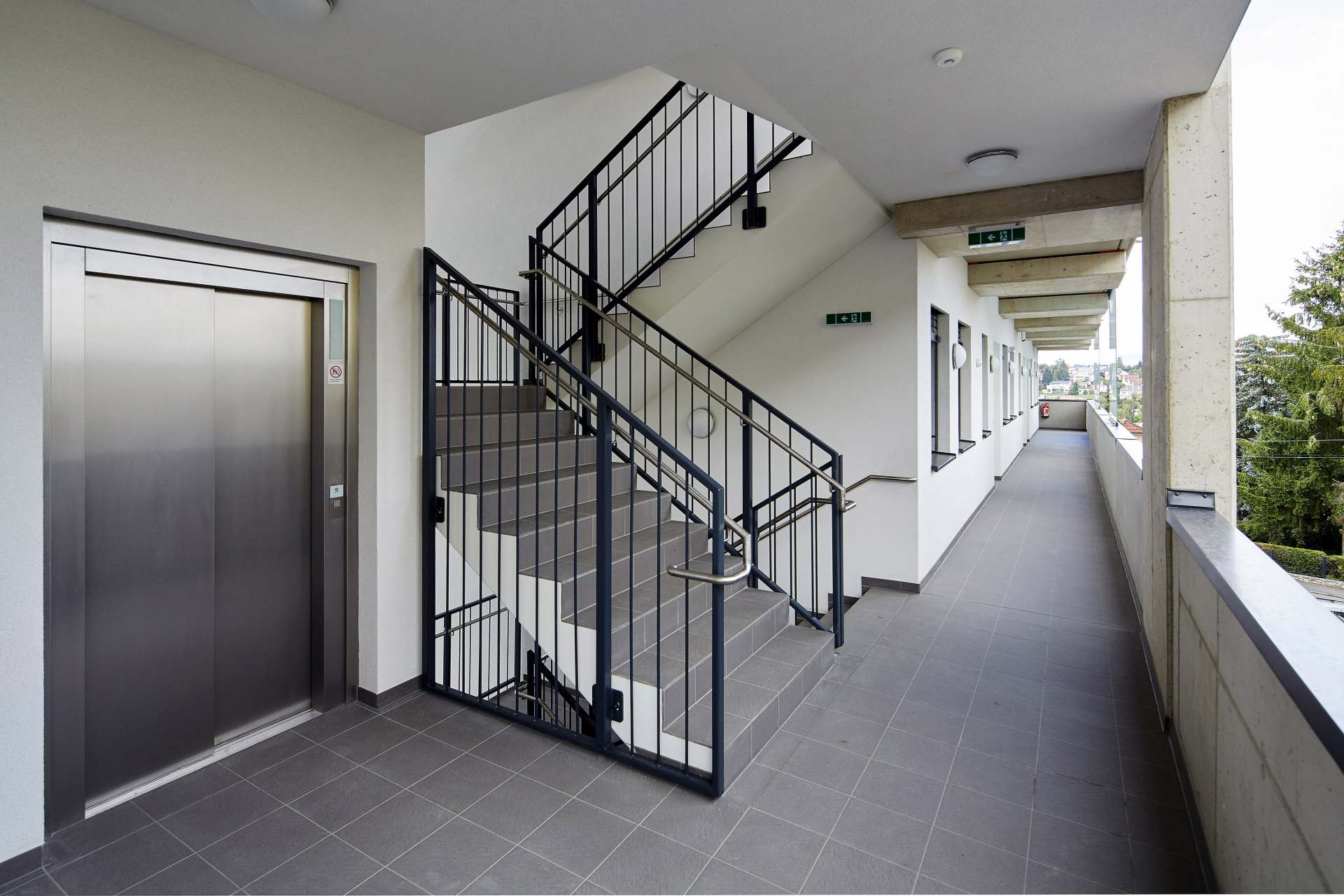 Die Anlage ist südwestlich orientiert. Über dem natürlich belichteten Tiefgaragen-parkdeck sind vier Wohnebenen behindertengerecht über ein zentrales Stiegenhaus mit Lift erschlossen.